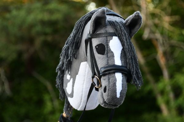 Tämä valloittava harmaa kirjava keppari on tehty velboa-kankaasta. Kuvassa näkyvät mustat suitset tulevat hevosen mukana.
