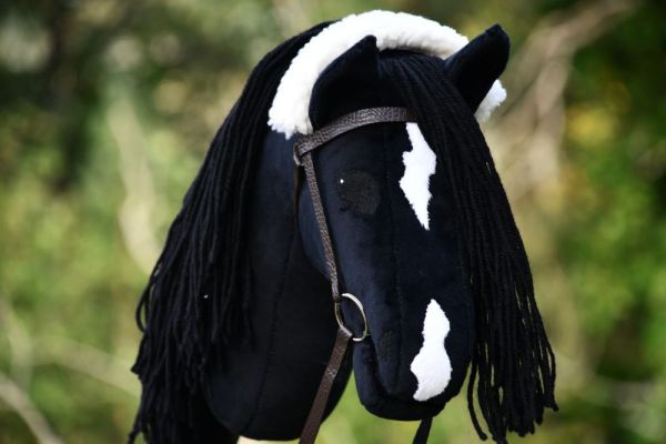 Tämä musta herttainen keppihevonen on tehty velboa-kankaasta, ja sen mukana tulee pehmustetut tummanruskeat turparemmittömät suitset. Kepparilla on tähti ja kuonopilkku.