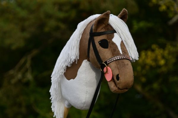 Tämä suloinen kirjava keppihevonen on tehty velboa-kankaasta, ja sen mukana tulee mustat suitset tuteilla.