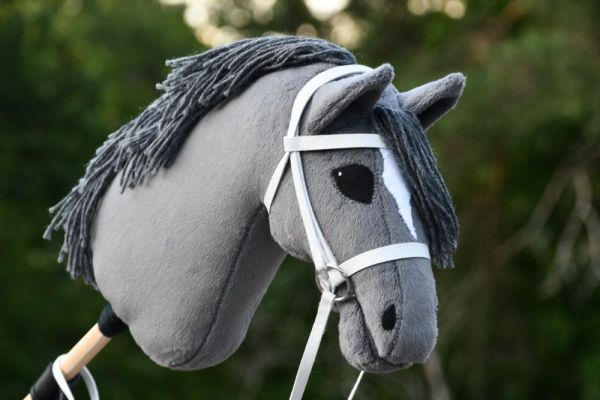 Tämä harmaa keppihevonen on tehty velboa-kankaasta. Tähän hevoseen kuuluu kaupan päälle valkoiset suitset.