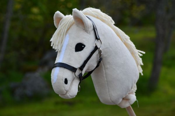 Tämä kermanvärinen keppihevonen on tehty velboa-kankaasta. Sillä on pitkä valkoinen piirto. Tähän hevoseen kuuluu kaupan päälle mustat suitset ja tummanruskea riimu.