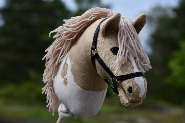 Tämä ruskea-valkoinen keppihevonen on tehty velboa-kankaasta. Siihen hevoseen kuuluu kaupan päälle mustat suitset ja musta riimu.