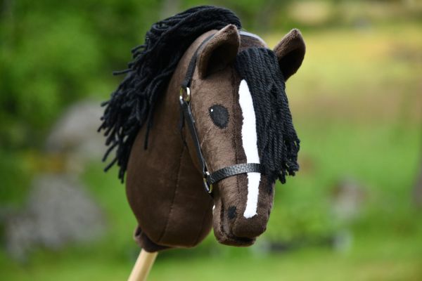 Tämä ruunikko keppihevonen on tehty brittiläisestä velboa-kankaasta. Tähän hevoseen kuuluu kaupan päälle mustat suitset ja musta riimu.