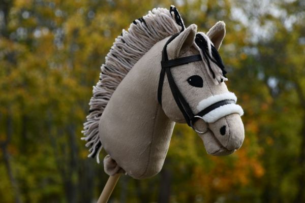 Tämä vuonohevos keppari on tehty velboa-kankaasta. Tähän hevoseen kuuluu kaupan päälle musta riimu ja tummanruskeat suitset, joissa on valkoinen pehmuste.