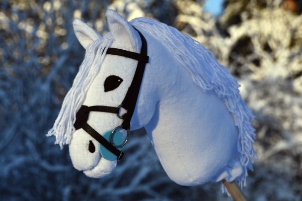 Tämä valkoinen on tehty velboa-kankaasta. Tähän hevoseen kuuluu kaupan päälle mustat suitset ja musta riimu.