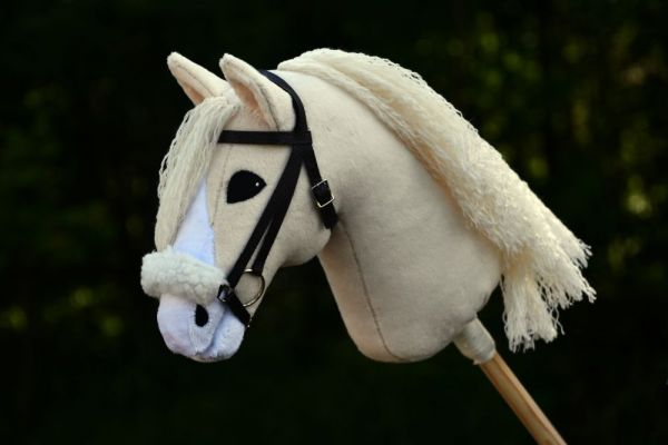 Tämä Voikko keppihevonen on tehty velboa-kankaasta. Tähän hevoseen kuuluu kaupan päälle mustat suitset.